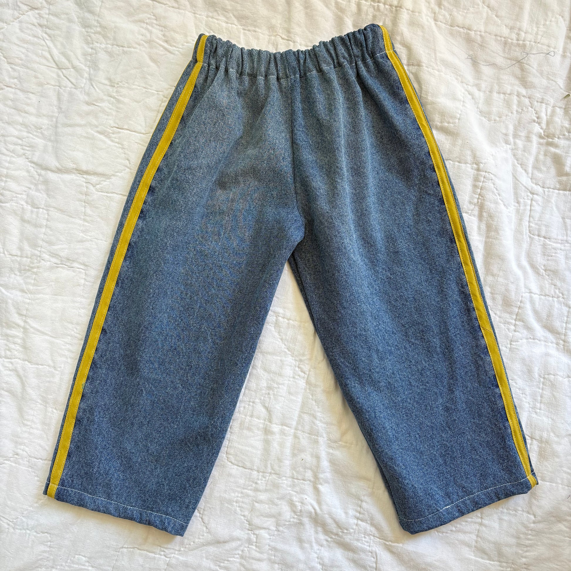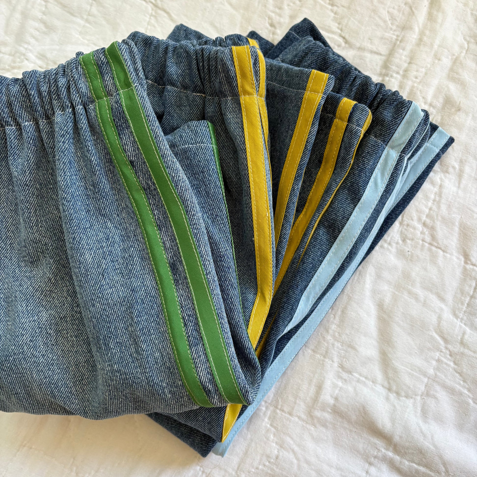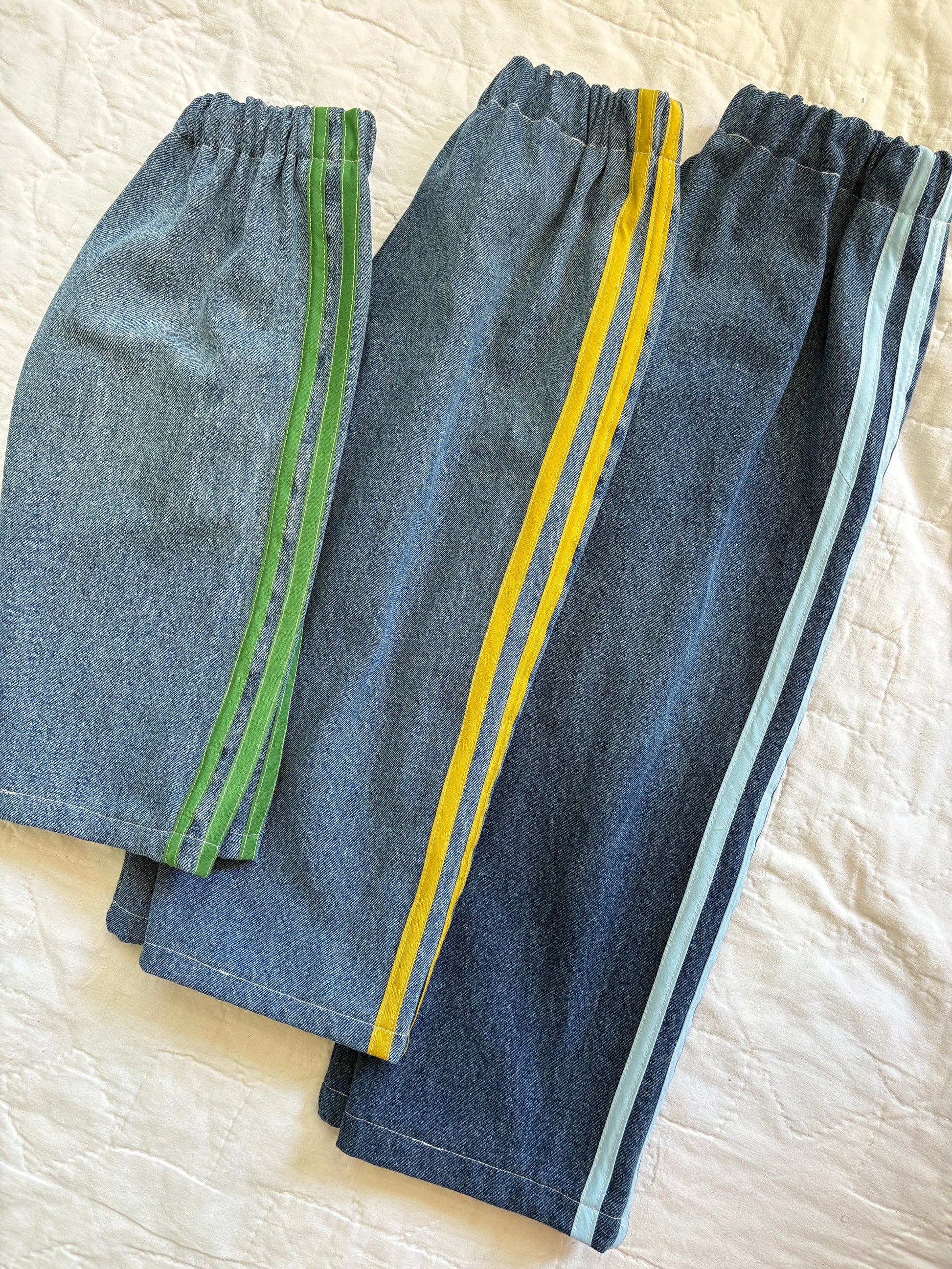 track stripe jeans. Upcycled from vintage & found cotton denim. These have an elastic waist and loose fit through the leg. Fun and playful!
