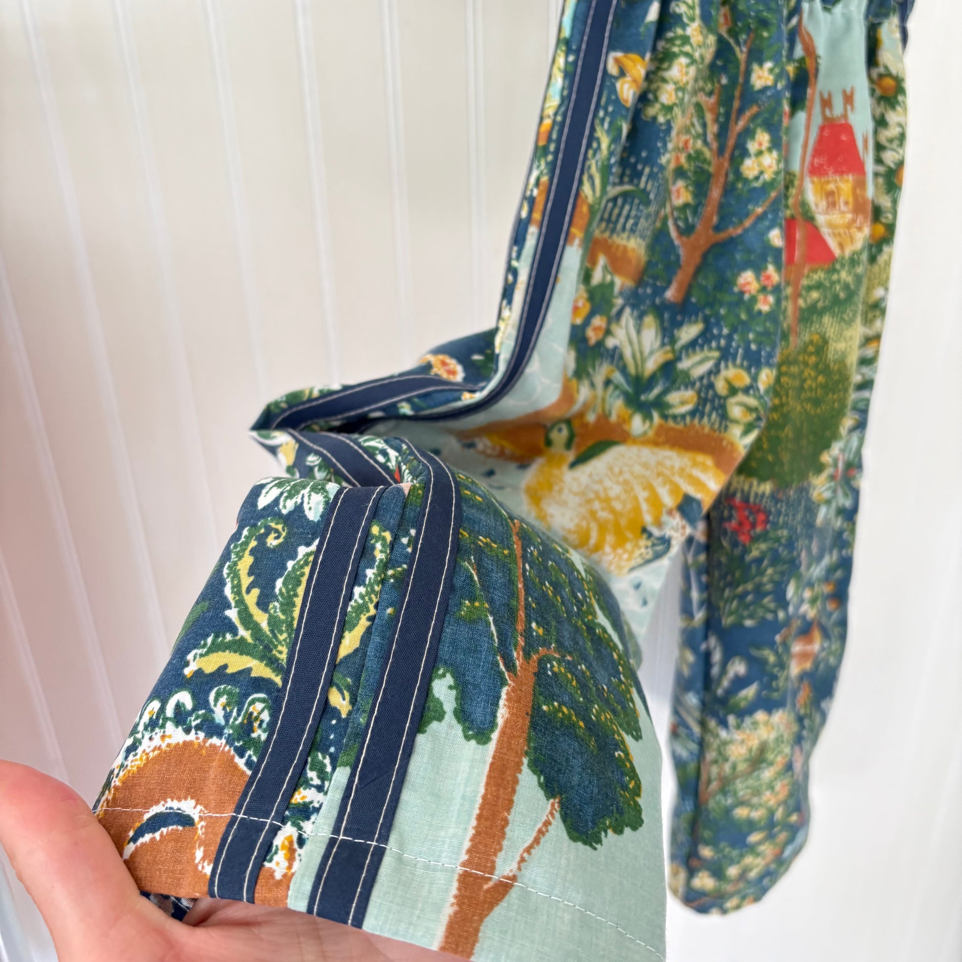 Pull on style with easy fit through the leg and elasticized waist. Sporty track stripe down the side of both legs. Handmade from vintage fabric, fully lined