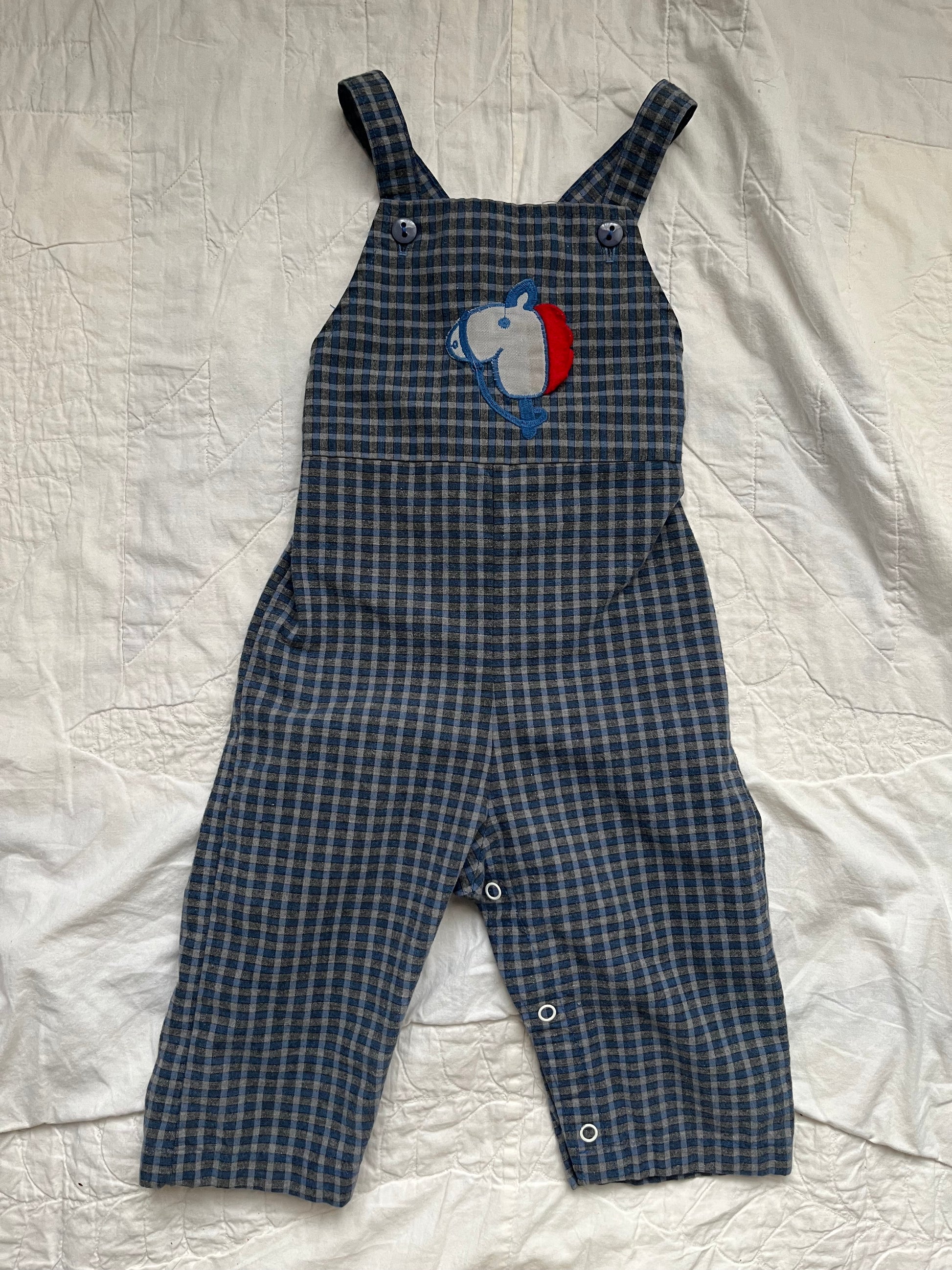 Cutest overalls with hobby horse appliqué. Soft plaid, feels like cotton. Leg snaps and cross back. Tagged 24m